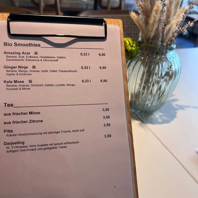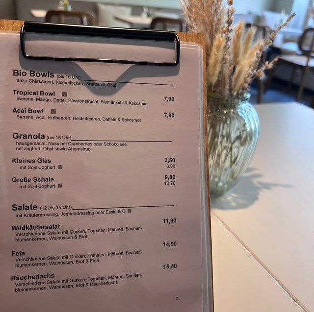 mit einem kleinen hausgemachten Granola +3,50 (mit Sojajogurt - vegan: 3,90) ; mit einem Bio-Spiegelei +1,50 ; mit Räucherlachs +3,00